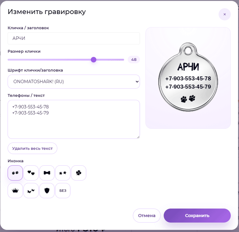 — разместить один или два номера И главное — вы оформляете заказ ровно с тем макетом, который видите. Без сюрпризов. Это сильно упрощает выбор и даёт спокойствие: Адресник будет именно таким, как вы задумали.