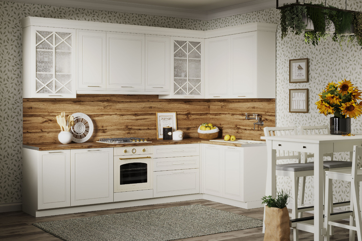 Иногда для создания идеальной кухни не нужно выбирать между уютом и функциональностью. Этот интерьер — прекрасное доказательство того, как можно сочетать классические белые фасады, тепло натурального дерева и романтику ботанических принтов, чтобы получить пространство, в котором хочется проводить время.