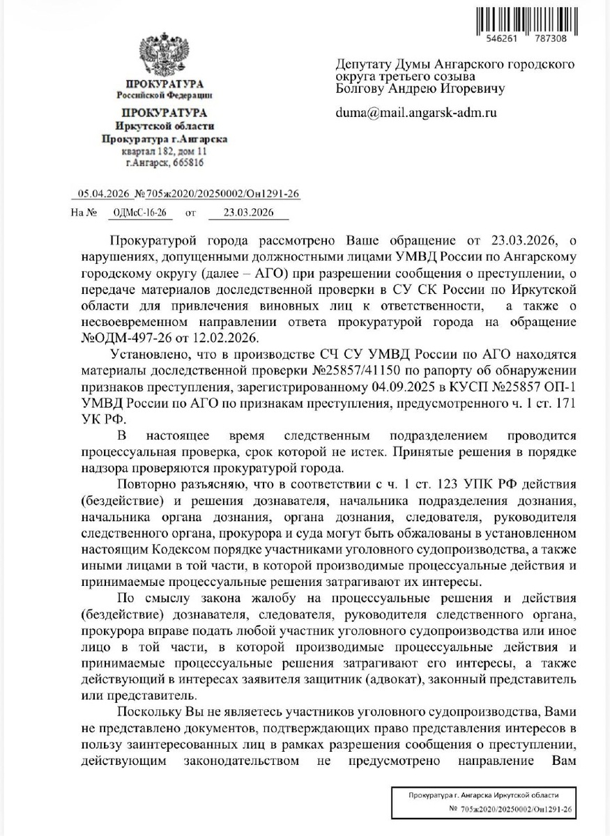 В сентябре 2025 года на территории Ангарского городского округа, в промзоне АНХК, была пресечена незаконная добыча песчано-гравийной смеси. Работала спецтехника. Были люди. Разрешительных документов — ноль. Ущерб государству, подтвержденный специалистами экологического надзора, составил 1 677 021 рубль. По факту была начата доследственная проверка. А дальше началась бюрократическая вакханалия. Что сделало МВД: Следователь вынес постановление об отказе в возбуждении уголовного дела. Формальное основание — «отсутствие сведений». При этом техника стояла на месте, люди были опрошены и фактически признались, ущерб подтвержден. Отказ был незаконным. Но он был. Что сделала прокуратура: Мне об этом эпизоде стало известно уже зимой 2026 года, когда изъятый экскаватор вернули владельцу. Я направил депутатское обращение в прокуратуру Ангарска. Срок ответа — 30 дней. Ответа не было. На звонки секретаря сначала ответили «висит в базе», потом перестали брать трубку. Пришлось обращаться в пр