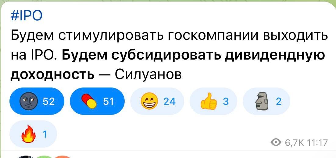 ? Что значит «субсидировать дивидендную доходность»? Что за лютую дичь я сейчас прочитал? Итак, краткая выжимка из курса экономики - «Дивиденд — термин, который означает часть прибыли, которую компания выплачивает акционерам.». Вот являюсь я условно (хотя почему условно?) акционером Лукойла, Сбера и ещё ряда крупных компаний. Лукойл, Сбер и ещё ряд крупных компаний это серьёзные прибыльные предприятия. И они часть этой своей прибыли регулярно распределяют между всеми держателями своих акций, чему эти самые держатели акций очень рады. Что вы там субсидировать собрались, как и за чей счет? Я слышу это так - «Мы, короче, с пацанами тут выведем на фондовый рынок некоторое количество госпредприятий, и если вдруг они будут убыточными, мы все равно сделаем так, чтобы они платили дивиденды, тем самым мотивируя не самых умных граждан покупать акции этих предприятий. Даже сами что-то прикупим на IPO. Откуда деньги на субсидирование? Да вон из бюджета возьмём, он же у нас резиновый. Далее схем
