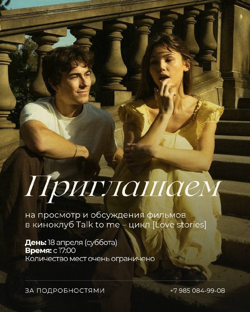 ] Любовь редко бывает простой и однозначной. В ней переплетаются опыт, ожидания, фантазии и внутренние сценарии, которые не всегда осознаются сразу. ▫️В нашем киноклубе мы будем смотреть фильмы о любви в самых разных её проявлениях: о близости и дистанции, притяжении и разочаровании, случайных встречах, глубоких связях и отношениях, которые оставляют след. После каждого просмотра –обсуждение. Вместе мы будем разбирать, почему герои выбирают именно такие отношения, какие внутренние сценарии стоят за их выбором, что человек ищет в другом и почему любовь нередко оказывается сложнее, чем кажется со стороны. ▫️Киноклуб – это не только просмотр фильма, но и возможность увидеть собственный опыт через историю на экране. Кино часто поднимает то, что в повседневности остаётся незамеченным, а разговор помогает лучше это понять и собрать в более ясную картину. Формат: просмотр + обсуждение Длительность: 3,5-4 часа Время: суббота, 17:00 По всем вопросам можно обращаться к нашему менеджеру: ht