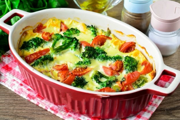 - Поставить в духовку, запекать при 180 градусах 20-30 минут до готовности омлета.