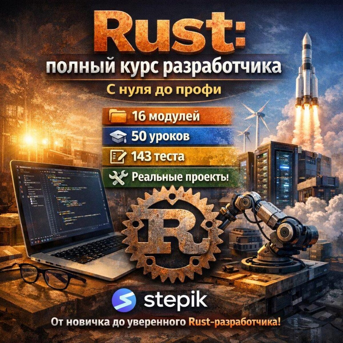 Знаете, что он быстрый, безопасный и что за ним будущее. Осталось одно: сесть и выучить. Этот курс со Stepik- кратчайший путь от «знаю что такое Rust» до «пишу на нём». 6 модулей, 50 уроков, 143 теста. Ownership, borrowing, traits, async, Tokio, Axum, макросы, WASM — всё разложено по полочкам и закреплено практикой. Никакого видео на 40 минут ради одной мысли. Подробный текст, много кода, реальные задачи после каждого урока. На выходе — портфолио из 10+ проектов: от CLI-утилит до REST API с базой данных. 48 часов действует скидка 55 процентов: stepik.org/course/269250