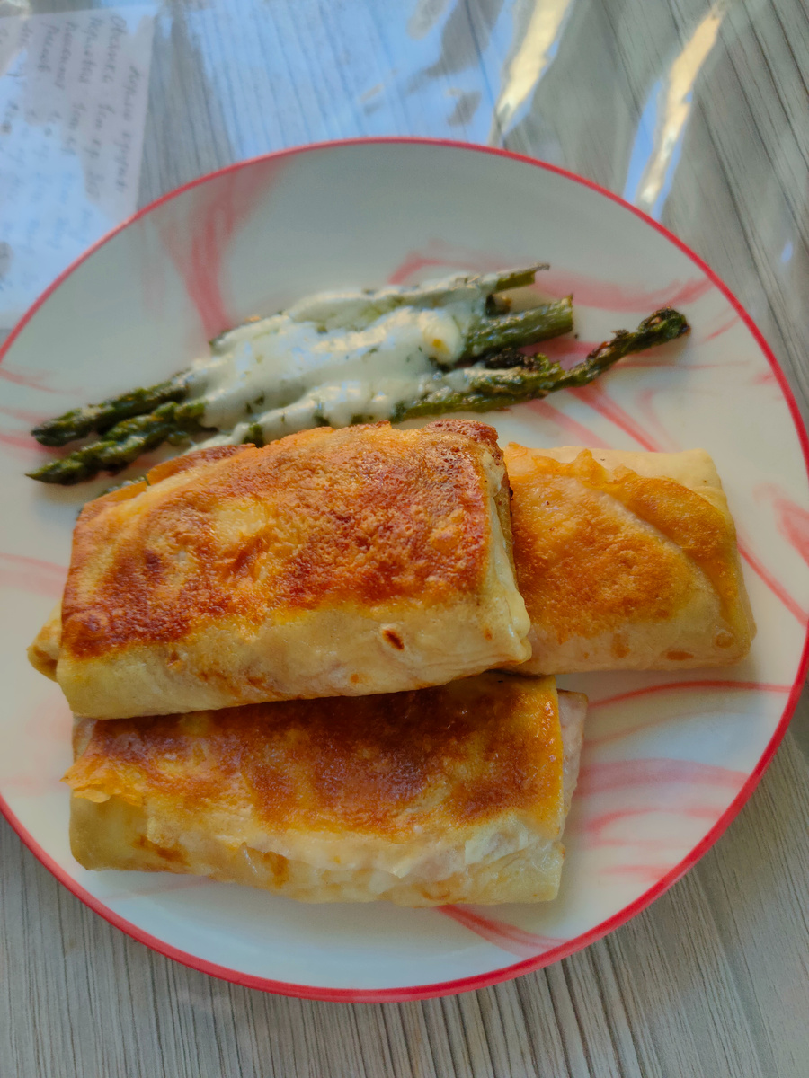 Добрый день, мои подписчики и гости моего канала. Пусть утро начинается с улыбки, с хороших нежных самых добрых слов! Пусть будет небо ясное над вами, а сердце греют счастье и любовь! Я рада вас видеть на своем канале, где я показываю меню на день и не только. Сегодня ночью опять была минусовая температура - 2 градуса. В 10 часов вышла в сад, а в ванночке лет мл 5 плавает, уже подтаял. так как утром было + 5градусов. На завтрак сегодня - фаршированные блинчики с творогом и вишней из заморозки, которые утром я только обжарила до румяной корочки + жареная спаржа под сыром сулугуни, тоже из заморозки, но скоро буду срезать свежую, уже появилась. чашка ароматного натурального кофе без сахара, но с конфетой Красный мак. После обязательной утренней прогулки по саду с Бобби, пошла в магазин, надо купить молочки, вся закончилась, но ей одной, конечно, не обошлось. Итак, что я купила сегодня, покажу по категориям. Молочка: молоко, кефир, молоко пастеризованное ( несколько лет не покупала, сего