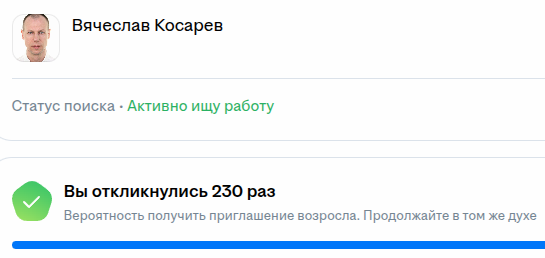 Сейчас на текущий момент, с хх у меня только один раз дошло дело до собеседования с помощью ручных откликов. Там я откликнулся около 70 раз.