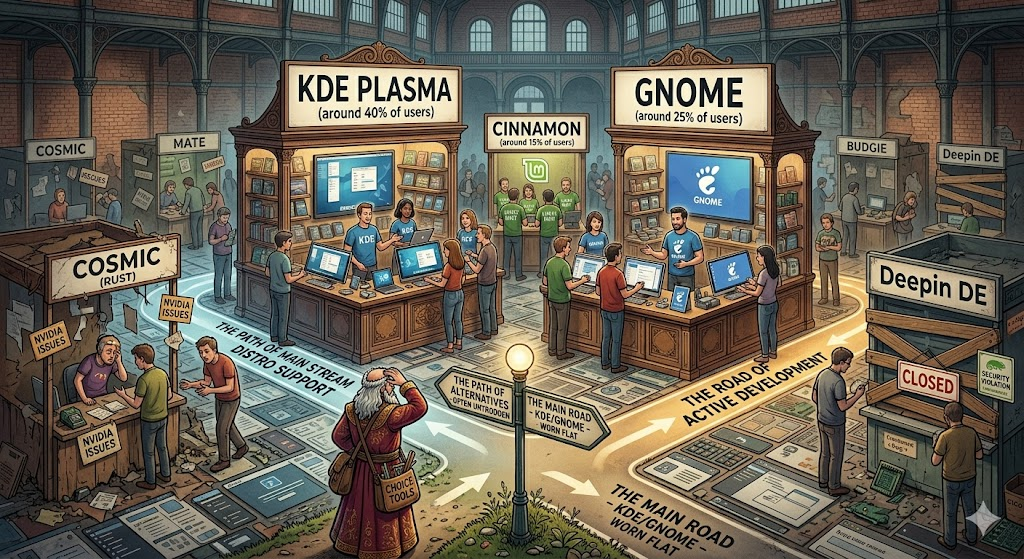 Привет! Когда-то мир Linux был похож на шведский стол, где у каждого повара был свой рецепт идеального рабочего стола. Сегодня же этот стол все больше напоминает фудкорт в торговом центре: есть огромный отдел с KDE, солидный ларек с GNOME, а все остальные ютятся где-то на задворках, пытаясь доказать, что их крафтовый интерфейс на Rust — это именно то, что вам нужно. Статистика — дама суровая. KDE Plasma и GNOME откусили 65% рынка, оставив конкурентам лишь крошки со стола. Даже Cinnamon, который кажется нам чем-то монументальным, держится на плаву только благодаря фанатам Linux Mint. Остальные проекты вроде Deepin или амбициозного новичка COSMIC напоминают стартапы, которые обещают перевернуть мир, но пока не могут даже нормально отрисовать значки в трее, чтобы те не исчезали в неизвестном направлении. Проблема в том, что «свобода выбора», которой так гордятся линуксоиды, для обычного пользователя выглядит как поход в магазин запчастей вместо покупки готового автомобиля. В Windows и ma