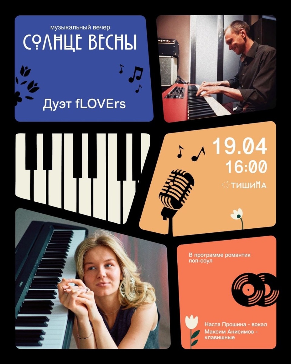 Творческое пространство «ТИШИНА» приглашает на музыкальный вечер «Солнце весны» с дуэтом fLOVErs. Анастасия Прошина (вокал) и Максим Анисимов (клавишные) исполнят романтик поп-соул — нежные мелодии, которые поднимают настроение и дарят ощущение тепла и солнца. 🤩19 апреля, 16:00 🤩Архангельск, Беломорской флотилии, 3 🤩Запись по ссылке 😊 Подписаться на «Радар Поморья» | Мы в MAX