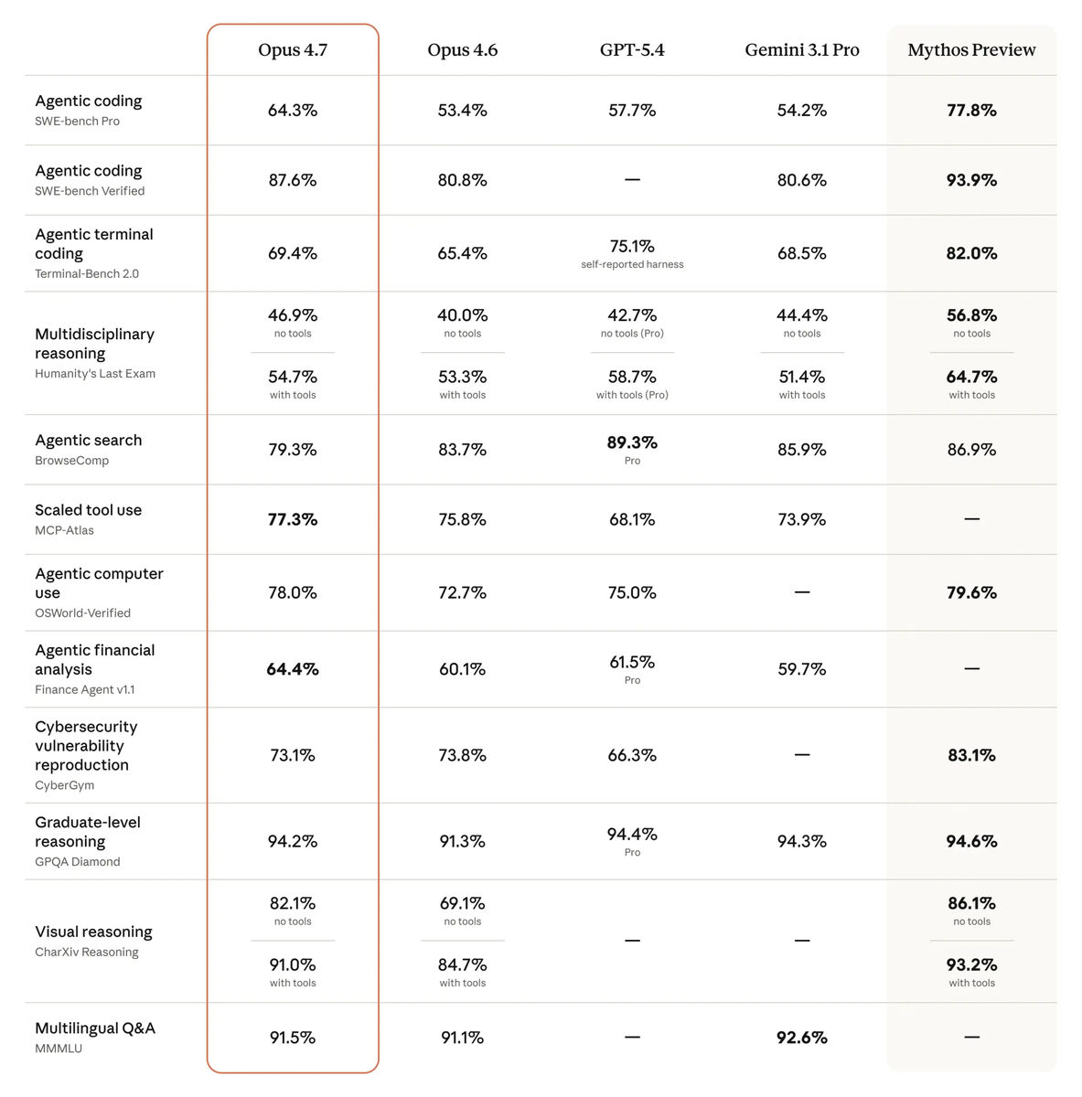 Последние новости только про антропик, что поделать они пока лучшие. Сегодня выпустили новую модель. Ничего особенного, просто чуть лучше Opus 4.6 почти во всём. То есть ещё больше отрывается от конкурентов. Также на бенчмарке показали модель Mythos, которую пока не хотят выкатывать в массы и тестируют с несколькими компаниями. Там вообще зверь какой-то 👨💻 🤖 В эпоху AI