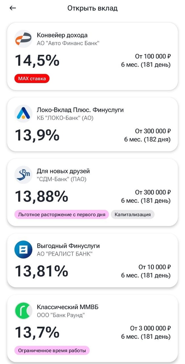 На 6 месяцев Лидирует Автофинанс банк😄 Кстати, короткая информация, для тех, кто возможно еще не знает. В нашей стране вклады застрахованы до 1,4млн максимум в 1 банк. Так что любой банк который состоит в реестре ЦБ - пригоден для размещения вкладов, даже если он не очень то на слуху. Кстати, Автофинанс АвтоВазу принадлежит - его всегда поддержут 😄 Не ИИР