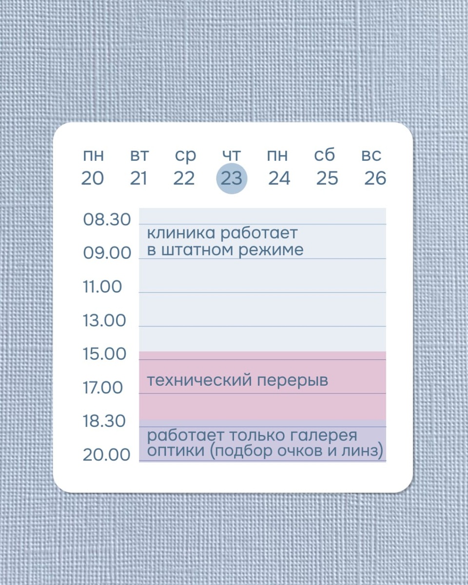 📍 пр. Ветеранов, 114 к.1 23 апреля 08:30 - 15:00 — работаем в обычном режиме 15:00 - 18:30 — технический перерыв с 18:30 — работает только галерея оптики (подбор очков и контактных линз) Пожалуйста, учитывайте это при планировании визита. Приносим извинения за возможные неудобства ❤️
