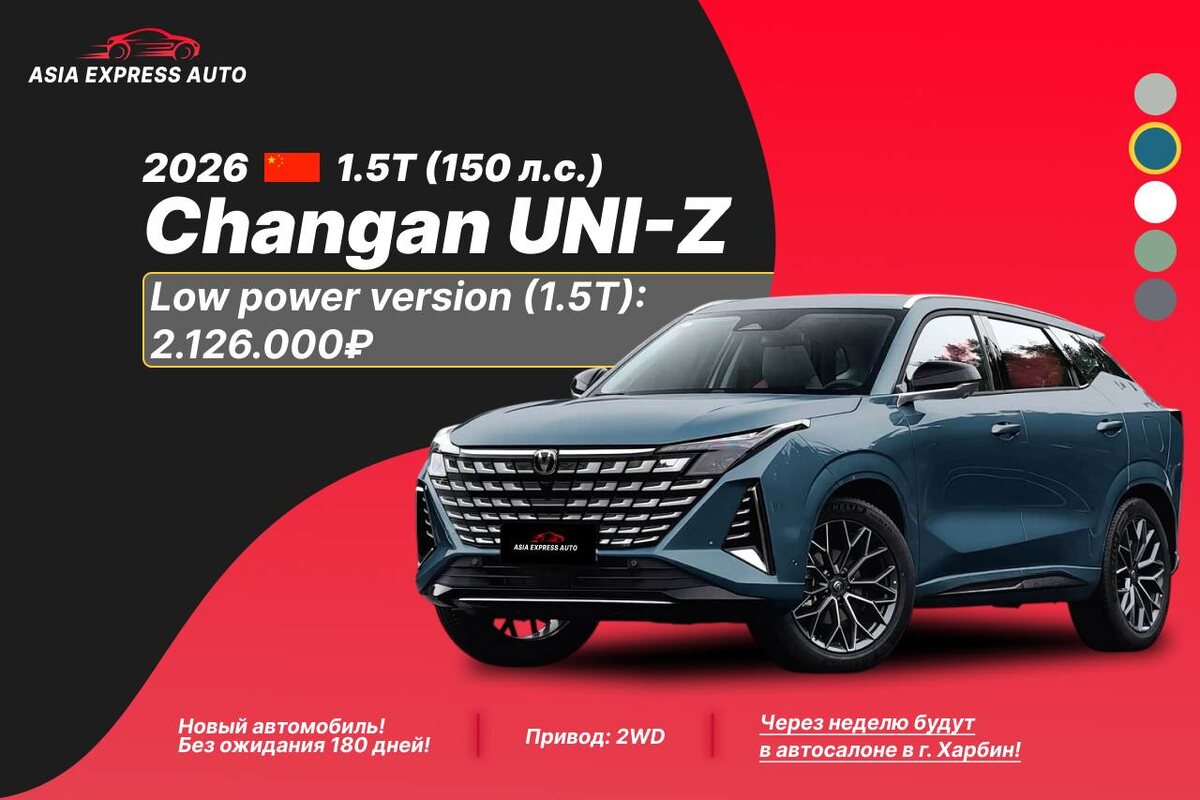 !🆕 🚀Через неделю будут в нашем автосалоне в г. Харбин!🚀 🔖Стоимость автомобиля рассчитана по курсу на сегодняшнее число до нашей стоянки в г. Благовещенск или Владивосток, с полным пакетом документов для постановки на учет! 🔖 Отправка в любой город! CHANGAN UNI-Z новый! ▫️Год: 2026 ▫️Двигатель: 1.5T (150 л.с.) ▫️Привод: 2WD ▫️Новый автомобиль!💎 💰Стоимость под ключ в РФ: 🔹Low power version (Нажмите на ссылку, чтобы увидеть комплектацию полностью): 2.126.000₽ 💸По курсу юаня 11.51 (с учетом комиссии 2% банка ВТБ) Если вас интересуют другие автомобили, напишите в комментариях — наши менеджеры с удовольствием рассчитают цену под ключ в РФ. ✍️ 🔴Смотреть адреса офисов #КитайAEA #НовыйAEA #СкороВНаличииAEA