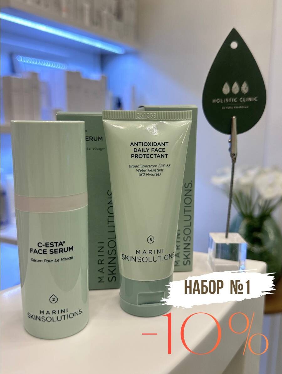 : НАБОР №1 со скидкой 10% MARINI SKINISOLUTIONS - два бестселлера в одном комплекте. Вы получаете полноценную защиту + мощное омоложение кожи. Экономия без потери качества. ✅ Антиоксидантный солнцезащитный крем SPF33 ☀️ Водостойкий, с увлажнением. Защищает от УФ-лучей и оксидативного стресса - идеальная база под макияж или самостоятельный финиш. ✅ Легендарная ремоделирующая сыворотка с витамином С + DMAE Подтягивает, осветляет, разглаживает. Работает на всех типах кожи - от жирной до чувствительной. Уважаемые пациенты, по всем вопросам приобретения 🛍️ Пишите администраторам в Telegram: +7-968-00-00-015 🌱 С любовью к вашей коже, Holistic Clinic