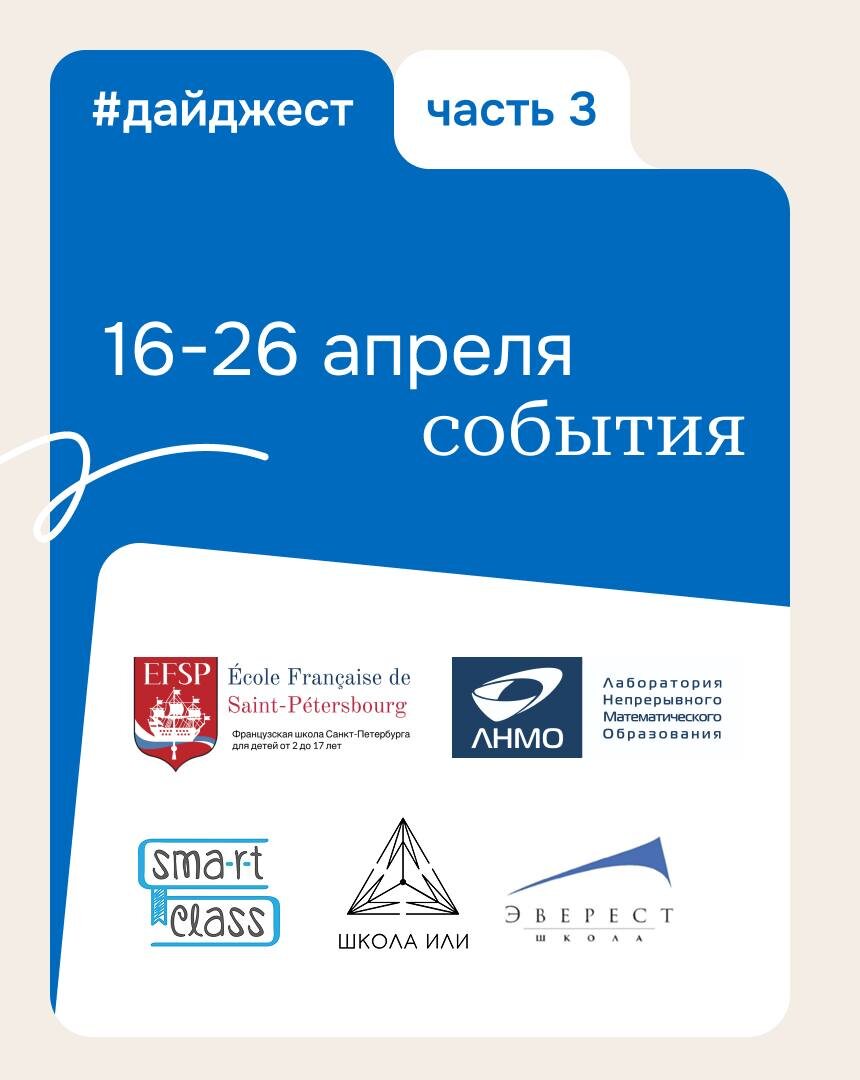 : • 25 апреля Большой день открытых дверей во Французской школе Санкт-Петербурга EFSP Адмиралтейский район https://vk.cc/cWEKfO • 25 апреля День открытых дверей в школе Smart Class Выборгский район https://vk.cc/cWEKui • 25 апреля Олимпиада «Естественный отбор» Адмиралтейский район https://vk.cc/cWEKPS • 25 апреля Круглый стол для родителей со школой Эверест Приморский район https://vk.cc/cWELch • 26 апреля Историческая антиконференция для школьников 12+ и взрослых «Один в поле воин. Герой и толпа» в школе ИЛИ Центр https://vk.cc/cWELA3 Мы ВК Сайт Просто Учиться Календарь событий Просто Учиться Мы на Яндекс.Дзен