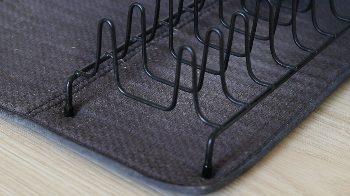 В этот раз я решила наконец обновить сушилку для посуды, а точнее коврик под ней. Чтобы вы понимали, старый выглядел вот так. Ему уже лет пять точно, он выцвел, полинял и весь в катышках. Там, где постоянно стояла посуда, появились белесые пятна. Думаю это из-за жесткой воды. Сама сушилка тоже постоянно в известковом налете, ее я периодически замачиваю с уксусом. А вот коврик пора менять!