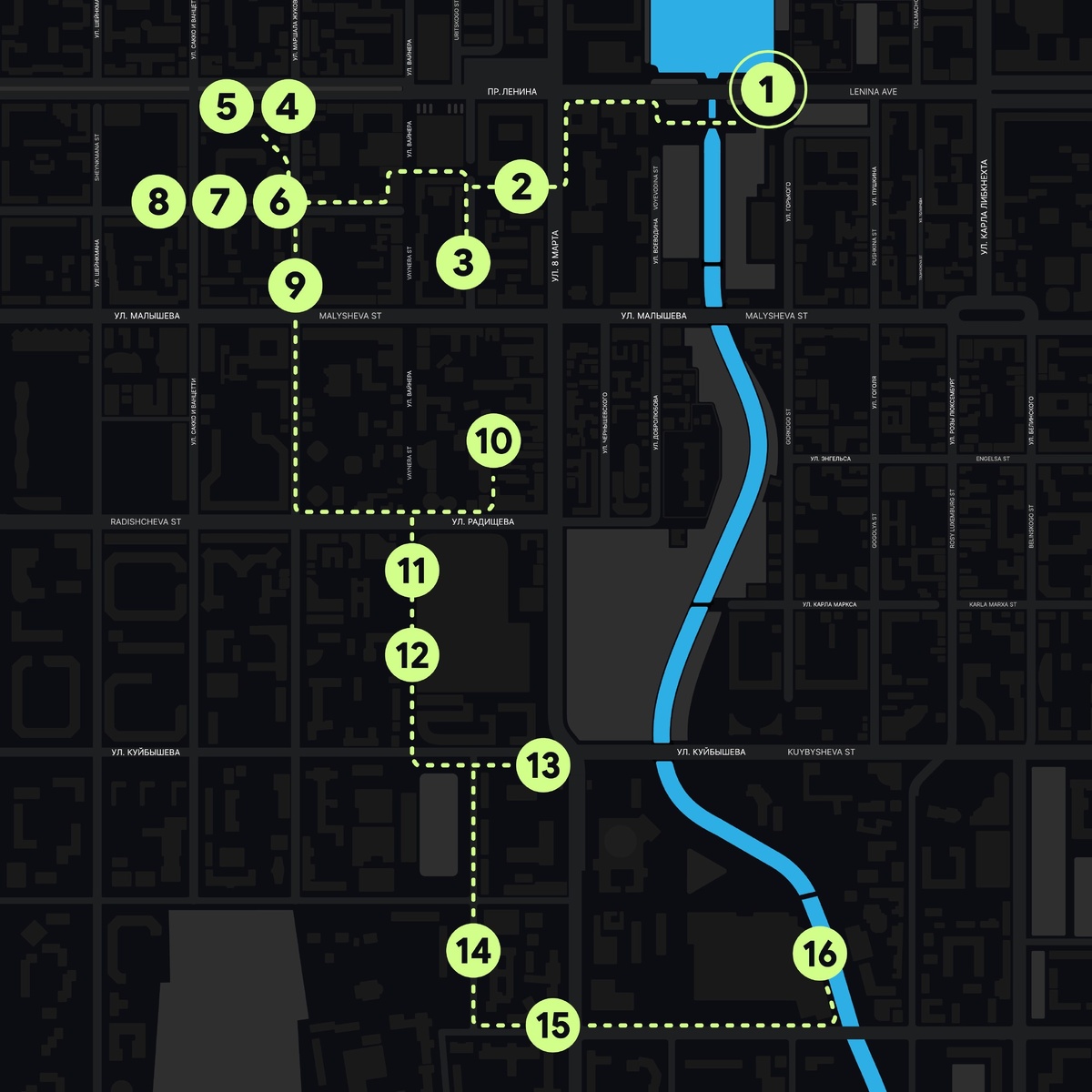 В маршрут вошли 16 точек — собрали работы разных лет и авторов. Они отличаются по стилю и идее, чтобы показать уличное искусство города во всем разнообразии. Гид показывает, где находится мурал, объясняет, как до него добраться, и на месте рассказывает, как создавали работу. Материалы доступны в тексте, аудио и видео — а экскурсия займет около двух часов.