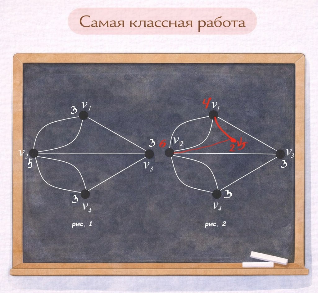 Решение Решить на практике эту задачу никто из жителей не смог. Покорилась она лишь Эйлеру, в то время работавшему в Петербурге. Легендарный математик не только расставил все точки над i, но и разработал общий принцип решения таких задач. Эйлер схематически изобразил структуру, которую образуют мосты и назвал её "графом". Точки на нём он назвал "вершинами", а соединяющие их линии - "ребрами". Ключевая догадка Эйлера состояла в том, чтобы подсчитать, сколько ребер выходит из каждой вершины. На рисунке 1: из 1-ой - выходит три ребра; из 2-ой - пять ребер; из 3-ой - три ребра; из 4-ой - три ребра. Все четыре вершины графа оказались "нечётными" (то есть из них выходит нечётное количество ребер). Немного поэкспериментировав, Эйлер вывел четыре основных правила для решения таких задач: 🤎Правило 1 Число нечётных вершин графа всегда чётно. Невозможно начертить граф, который имел бы нечётное число нечётных вершин. 🤎Правило 2 Если у графа все вершины чётные, то его можно начертить о