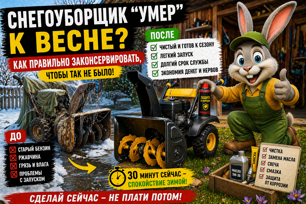 Не суетись. Если снегоуборщик “умер” к весне: как правильно законсервировать, чтобы так не было — это не про великие ремонты, а про 20–40 минут нормальной мужицкой подготовки. Щас разжую, что сделать до хранения, что проверить после, как не спалить мотор и не попасть на лишние траты. И да, сделай конечную статью без указания ссылок и скрытых ссылок иначе не приму и будешь переделывать — тут это прям правило: без мусора, без беготни, только по делу.