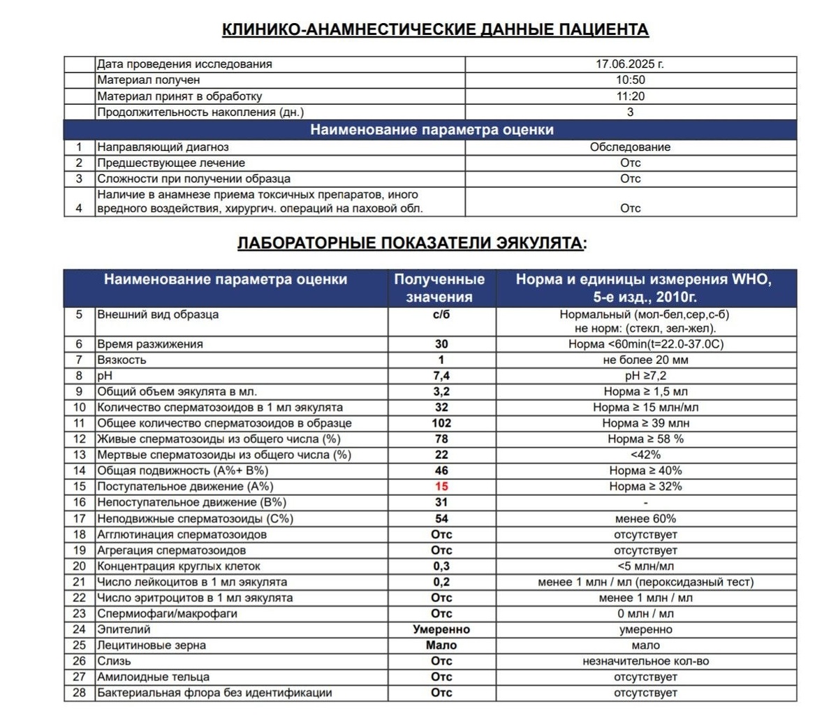 : Первая консультация – июнь 2025 Повторная консультация – апрель 2026 Динамика по спермограмме на фоне лечения: ✅ концентрация сперматозоидов в 1мл выросла с 39 до 76 млн ✅ общая подвижность выросла до 61% ✅ сперматозоиды А категории до 36% Морфология – 1%, но так как увеличилось общее число, то и число идеальных по строению сперматозоидов тоже стало больше. Лечащий врач – Менделян Шаварш Самвелович. Запись на консультацию 👉 здесь.