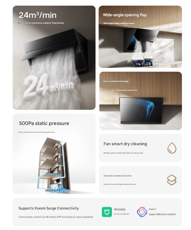 Сколько раз вы стояли над плитой, а дым заполнял всю кухню? Xiaomi предлагает решение — новая смарт‑вытяжка Mijia 3C, которая не только «вытягивает» запахи, но и «общается» с другими устройствами вашего умного дома. Главное отличие — сочетание профессионального уровня мощности и цены, доступной даже для бюджетных покупок. При 24 м³/мин вытяжка справляется с самым плотным дымом от жарки в вок. Технически устройство работает на полностью закрытом высокоскоростном моторе, что повышает долговечность и снижает уровень шума. Высокое статическое давление 500 Па гарантирует равномерный отток даже при забитом дымоходе. Плоская стеклянная панель с углом захвата 60° и автоматическим наклонным лотком «перехватывает» дым прямо у его источника, не позволяя ему попасть в помещение. Забудьте о масляных отпечатках на стекле. Система сенсоров фиксирует движение руки в диапазоне до 30 см, позволяя включать/выключать вытяжку и менять скорость одним взмахом. Для тех, кто предпочитает классическое управлени