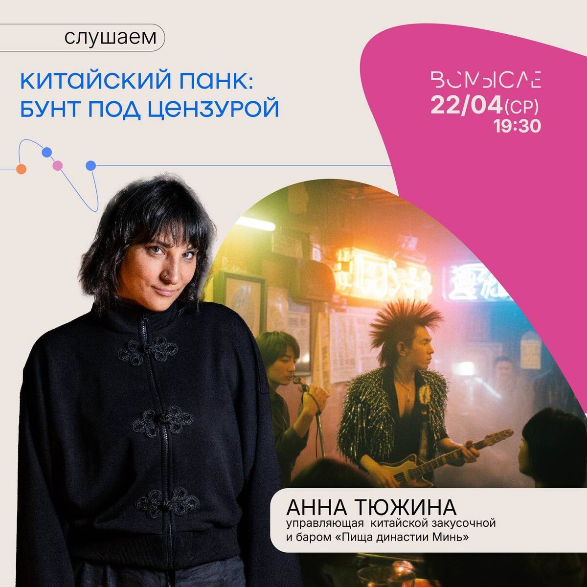 любопытнейшая: 🗓️ 22 апреля в 19:30 «Китайский панк: бунт под цензурой» — Анна Тюжина (управляющая китайской закусочной и баром «Пища Династии Минь») "Пекин, Ухань, конец 80-х. В стране, где нельзя шуметь и выделяться, появляются ирокезы, рваные джинсы и песни, которые лучше не петь в эфире. От подпольных тусовок в караоке-залах до криков «Да — независимому Тайваню!» со сцены — китайский панк всегда шёл ва-банк. Разберём, как эти ребята выжили под цензурой, зачем бегали голыми по ночам и почему до сих пор остаются костью в горле у системы." 📍Собираемся в среду 22 апреля в 19:30 в сообществе Всмысле (пространство SENO, ул. Гороховая 47) 2️⃣ 🎟️ Купить билет 🎟️