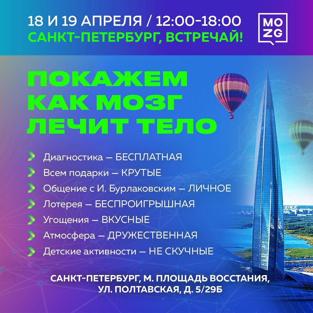 18 и 19 апреля приглашаем вас в Санкт-Петербург – покажем, где на самом деле прячутся источники вашего состояния! Что вас ждёт: ✅ Научим проверять себя и близких – без сложных приборов. Вы узнаете, как замечать проблемы у детей и родителей до того, как они станут серьёзными. ✅ Бесплатное тестирование организма от наших специалистов – диагностика, которая видит скрытое: мышцы, тонус, зажимы, перекосы. Уйдёте с картой своего тела и планом действий. ✅ Живое выступление и возможность задать вопросы лично автору методов «Ренервация» и «Ревагус» – Илье Бурлаковскому, нейрофизиологу и основателю MOZG. ✅ Беспроигрышная лотерея – подарки каждому посетителю и скидки до 50% на программы. Главный победитель получит «Программу X» за счёт клиники. Детали: 📍 Санкт-Петербург, Полтавская, 5/29Б 🗓 18 и 19 апреля, 12:00–18:00 Регистрация: https://mozg.center/welcomespb Приходите разобраться со своим здоровьем по-настоящему!