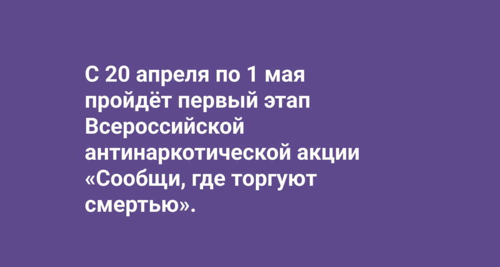 С 20 апреля по 1 мая пройдёт первый этап Всероссийской антинаркотической акции «Сообщи, где торгуют смертью». Основная цель – привлечь внимание общественности к противодействию незаконного оборота наркотиков и их потребления, а также рассказать о возможностях лечения и реабилитации наркозависимых лиц. Жители Темрюка и Темрюкского района могут сообщить о распространителях и перевозчиках запрещённых веществ, их пропаганде и наркопритонах по телефонам доверия: Администрации поселений Темрюкского района: