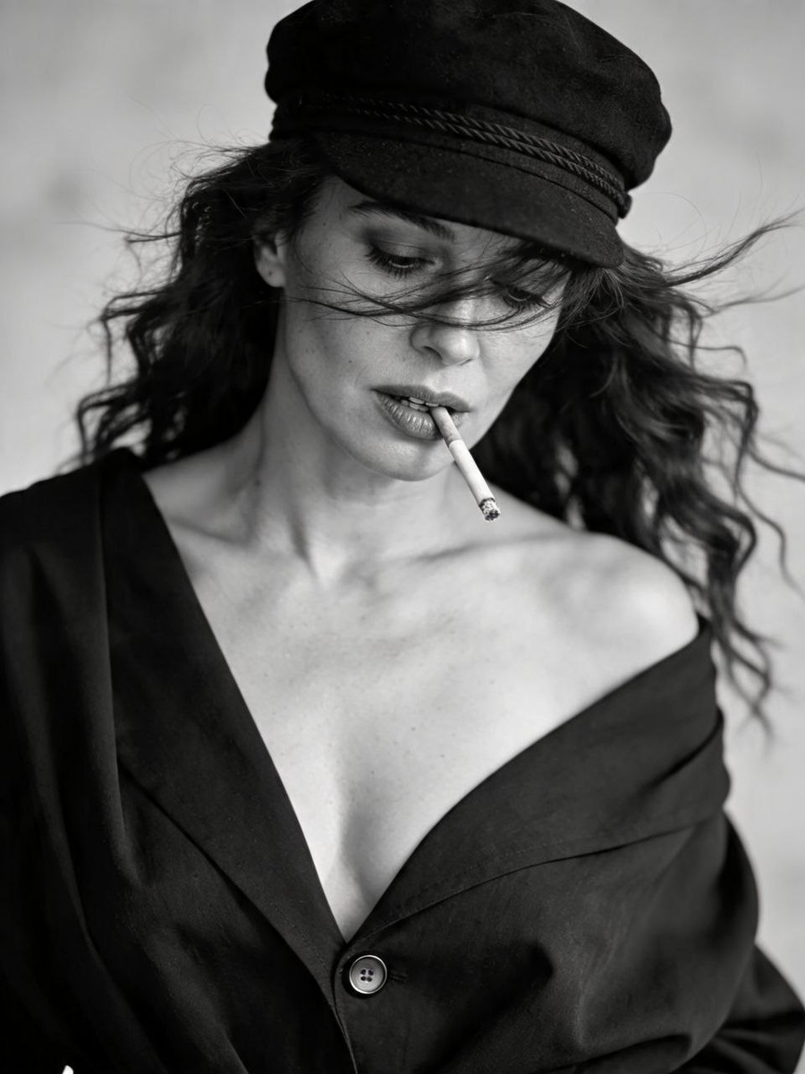 От подписчика @andrewrochev. Фото сделано в seedreem, у которой сильно ниже цензура и которая доступна в most-ai с очень приятным кэшбеком по промокоду от автора канала) Создай чёрно-белую фотографию в стиле модной фотосессии. Модель — женщина (лицо и детали внешности возьми с загружённого фото) с длинными волнистыми волосами, которые слегка растрёпаны ветром. Волосы должны естественно спадать на плечи и частично закрывать лицо. Модель носит тёмный берет, который добавляет образу нотку французского шика. На ней расстегнутый тёмный свободный плащ, небрежно наброшенный на плечи и застёгнутый на нижнюю пуговицу. Под плащом ничего нет, поэтому видно немного груди в V образном вырезе плаща. Выражение лица модели должно быть задумчивым, немного отстранённым — она смотрит вниз, губы слегка приоткрыты. В уголке рта — сигарета, которая подчёркивает атмосферу лёгкой небрежности и бунтарства. Освещение мягкое, с плавными тенями, создающее драматичный, но не перегруженный контраст. Фон размытый,