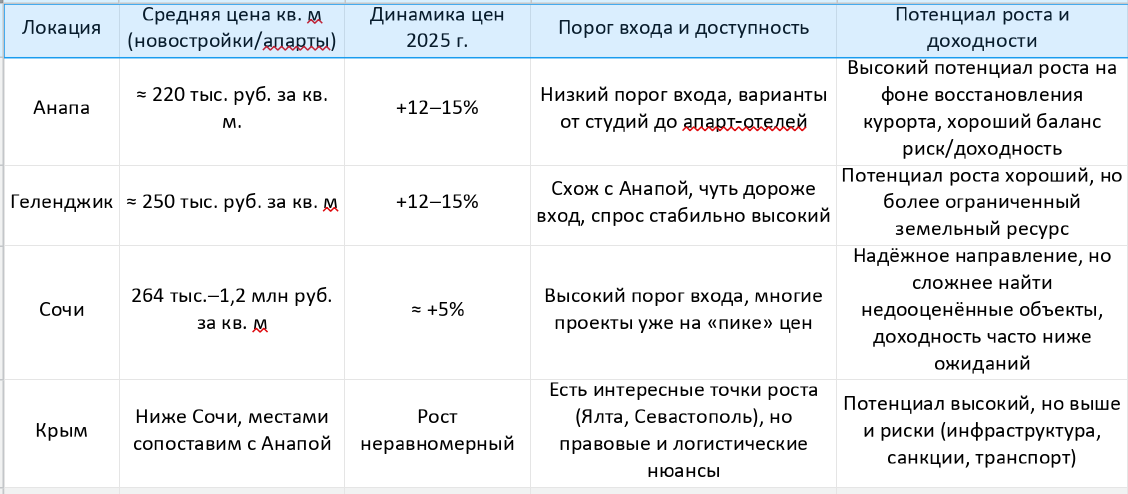 Анапа по сути занимает нишу «семейного, более доступного курорта»: цены ниже, чем в Сочи и во многих крымских локациях, но ликвидность в нормальных проектах уже сопоставима. Аналитики отмечают, что для инвесторов, которым Сочи кажется «перегретым», Анапа становится главным направлением для инвестиций: входной бюджет ниже, а потенциал роста при восстановлении полноценного сезона — выше.
