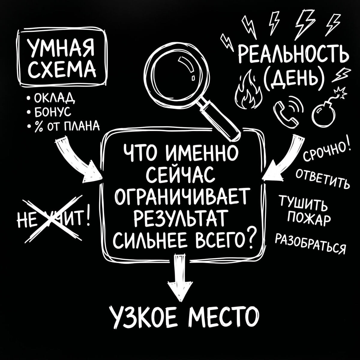 #ОтХаосаКУправлению #управление #автоматизация #хаос Часть №4 После отчетов я довольно серьезно ушел в мотивацию. И тут тоже все выглядело красиво: Есть оклад. Есть бонус. Есть план. Есть процент. Есть зависимость от результата. Казалось бы, чего еще надо. Если человек понимает, что его деньги зависят от итога, он должен начать жить этим итогом. Я много раз так думал. И много раз видел, что на практике это работает куда слабее, чем кажется в эксельке. На бумаге у человека все привязано к результату. А в жизни его день все равно собран из мелких реакций. То одно всплыло. То другое. То срочно ответить. То кого-то догнать. То где-то разобраться. То потушить очередное «надо было еще вчера». Я прямо ловил себя на внутреннем конфликте. Схема мотивации вроде умная. А поведение не становится управленческим. И вот это меня, если честно, сильно отрезвило. Потому что я долго верил, что хорошая формула оплаты сама по себе чему-то учит. Неа... у меня не стала учить. Она может подталкивать.
