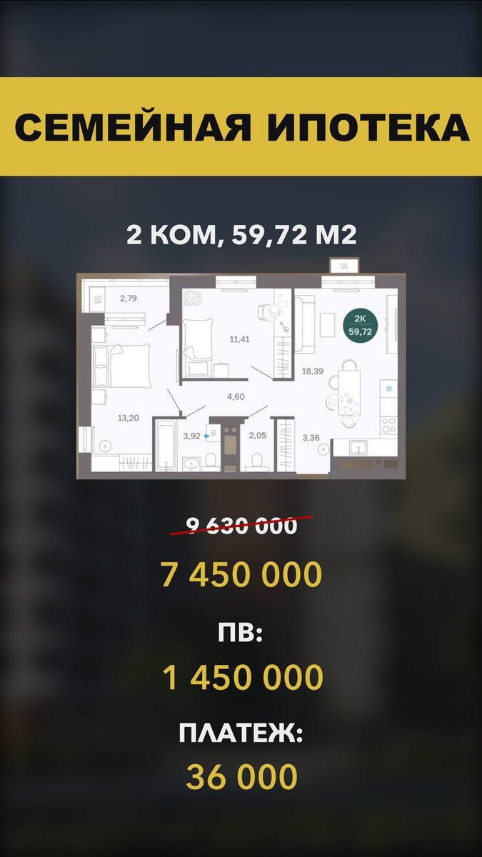 ☀️☀️☀️☀️☀️ ⚡️Готовая 2-комнатная квартира в центре города со скидкой 2,18 млн и платежом ниже аренды Если вы ищете квартиру для семьи и для собственного проживания, сейчас на рынке есть действительно сильный вариант. ❗️Что по цифрам: 〰️площадь: 59,72 м² 〰️старая цена: 9 630 000 ₽ 〰️цена сейчас: 7 450 000 ₽ 〰️выгода: 2 180 000 ₽ 〰️платёж по семейной ипотеке: около 36 000 ₽/мес И здесь важно не только то, что цена резко снижена. 🏡 Важно, что это готовый дом в центре города. То есть вы покупаете квартиру, в которую можно заходить уже сейчас, без ожидания стройки и без риска, что потом условия на рынке станут хуже. ❓Почему это сильный вариант для семьи: 〰️эргономичная 2-комнатная планировка 59,72 м² 〰️просторная кухня-гостиная 〰️2 санузла 〰️ниша под шкаф 〰️удобное разделение приватной и общей зоны 📎Плюс по самому дому: 〰️двор без машин 〰️подземный паркинг 〰️тренажёрный зал То есть это не просто квартира в хорошем районе. Это уже готовое решение для жизни в центре, где комфорт