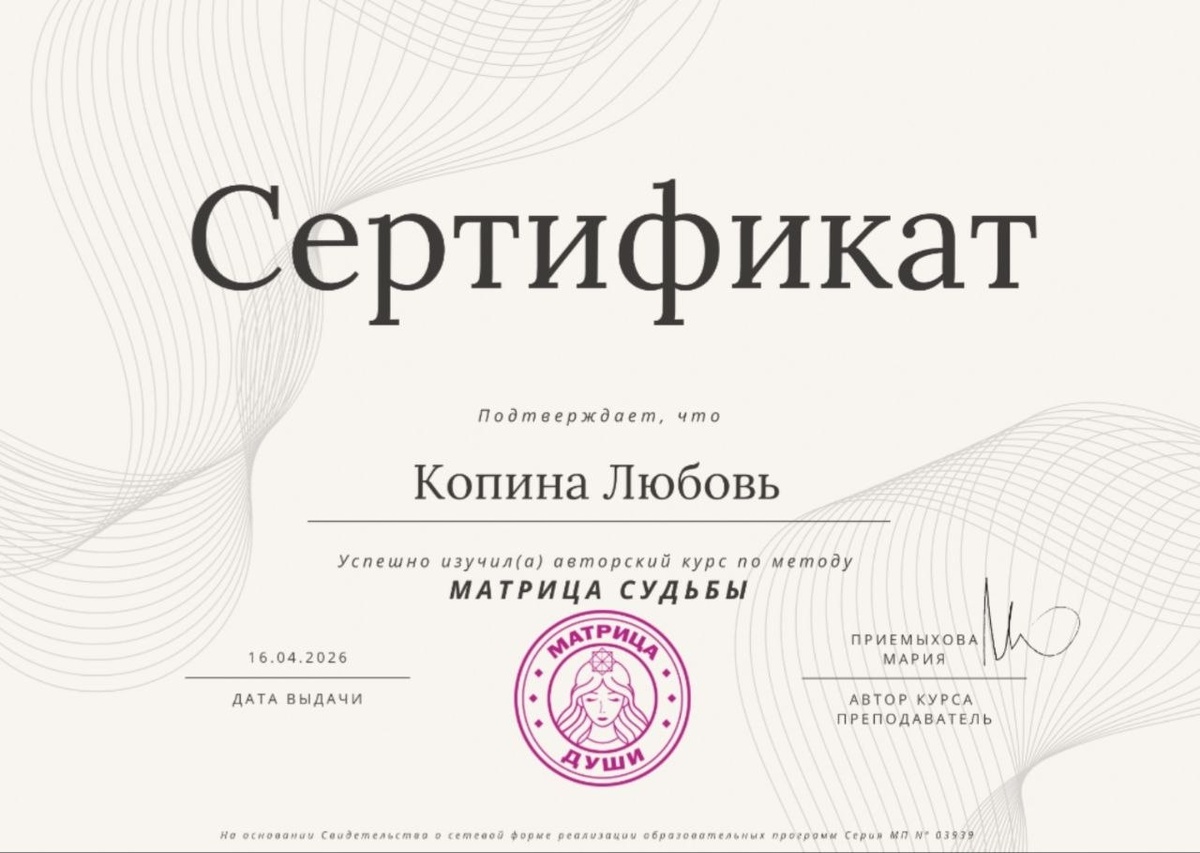 А вот и сертификат мой по матрице судьбы пришёл. Основная учёба пройдена, но поддержка автора курса и коллектив учеников остаётся и это здорово.