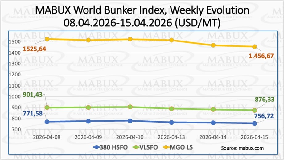 ‼️Представляем обзор бункерного рынка, подготовленный МАВUХ. С момента объявления перемирия на Ближнем Востоке 08 апреля мировой бункерный рынок перешел в фазу временной стабилизации, сопровождающуюся умеренной нисходящей коррекцией. 📌 По итогам недели индекс 380 HSFO сократился на 14.86 USD: с 771,58 USD/MT на прошлой неделе до 756.72 USD/MT. 📌 Индекс VLSFO уменьшился еще на 25.10 USD (876,33 USD/MT против 901.43 USD/MT на прошлой неделе), пробив отметку в 900.00 USD. 📌 Индекс MGO LS опустился на 68.97 USD (с 1525,64 USD/MT на прошлой неделе до 1456.67 USD/MT), опустившись ниже отметки в 1500.00 USD. MGO LS при этом остается самым волатильным сегментом мирового бункерного рынка. 380 HSFO - High sulphur fuel oil 380-cst - тяжелое высоковязкое топливо c вязкостью 380 сст VLSFO - Very Low Sulphur Fuel Oil - топливо с низким содержанием серы (до 0,5%) MGO LS - Marine gasoil Low sulfur - низкосернистое дизельное топливо (до 0,1%) На момент написания анализа на мировом бункерном