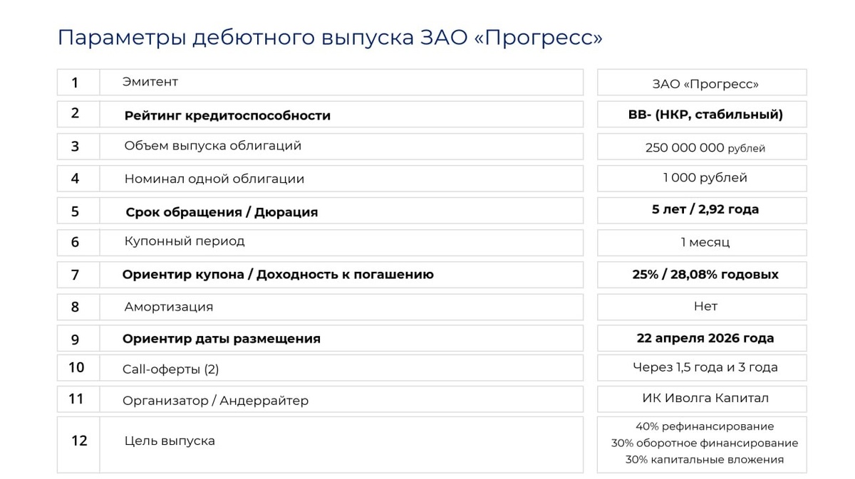 На 22 апреля запланировано дебютное размещение растениеводческого хозяйства ЗАО Прогресс 🌾 Основные предварительные параметры выпуска облигаций ЗАО Прогресс:
