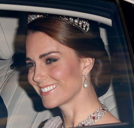 На банкете в честь короля Испании Фелипе и королевы Летиции Кейт появилась в образе, где главную роль сыграло рубиновое колье — вместе с тиарой “Узелки любви” королевы Марии, а также коллингвудскими жемчужными серьгами принцессы Дианы. Сложная комбинация, скажете вы? Да. Но именно это и впечатляет: вместо того чтобы спорить с историческими аксессуарами, Кейт собрала образ так, что всё смотрелось единым ансамблем.