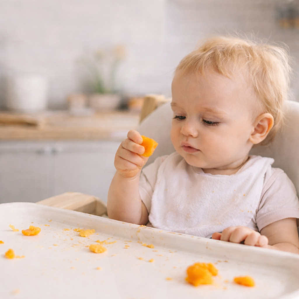Есть простой прием, который реально помогает. Не начинайте кормление сразу. Дайте ребенку сначала включиться в процесс. Положите перед ним кусочек еды, дайте потрогать, размазать, попробовать самому. Без ложки, без давления.