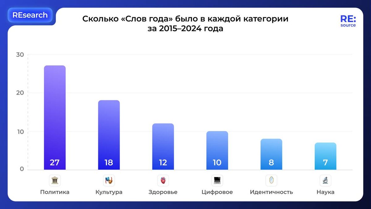 🔹🔹🔹 Каждое третье слово года — про политику Команда RE:source создала интерактивный дашборд со Словами года из 9 разных источников за 2015-2024 года. В исследование вошли как русскоязычные, так и иностранные слова по 6 категориям. Больше всего набралось политических слов — 27 штук. На втором месте с отрывом в 9 слов — категория «Культура». Из интересного: 🌀Словарь Collins идет в ногу с технологической повесткой. Он единственный, кто выбрал AI словом года (2023), а до этого у него был NFT (2021). 🌀Oxford перестал следить за миром и начал следить за TikTok — последние 3 года слова отражают культурные тренды. Изучайте дашборд и получайте новые инсайты! Источник: RE:source (рус) #REsearch Подписаться на RE:sourc