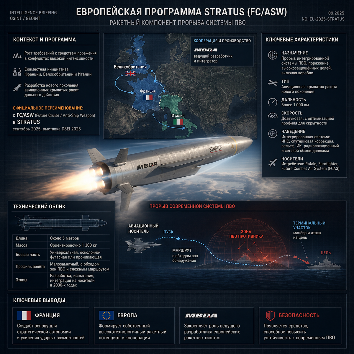 В условиях нарастания требований к средствам поражения в конфликтах высокой интенсивности Франция и её союзники реализуют программу создания нового поколения авиационных крылатых ракет STRATUS (ранее FC/ASW — Future Cruise/Anti-Ship Weapon). Работы ведутся в кооперации с участием компании MBDA в интересах Франции, Великобритании и Италии. Программа официально переименована в STRATUS в сентябре 2025 года на выставке DSEI 2025. Целью проекта является замена к началу 2030-х годов существующих образцов авиационных средств поражения, включая крылатые ракеты SCALP / Storm Shadow (дальность до 250–560 км по различным модификациям) и противокорабельные ракеты Exocet и Harpoon. Программа STRATUS предусматривает создание двух взаимодополняющих ракетных систем: — STRATUS LO (Low Observable) — дозвуковая малозаметная ракета (TP15), предназначенная для скрытного проникновения на дальностях свыше 500 км с использованием профиля полёта на малых высотах и технологий снижения радиолокационной заметност