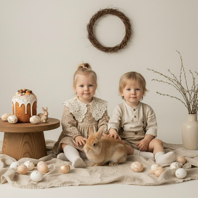 — Мальчик: светлая рубашка (лён/хлопок) с длинным рукавом, бежевые шорты на подтяжках или мягкие брюки, нейтральные оттенки (кремовый, молочный), светлые носки.