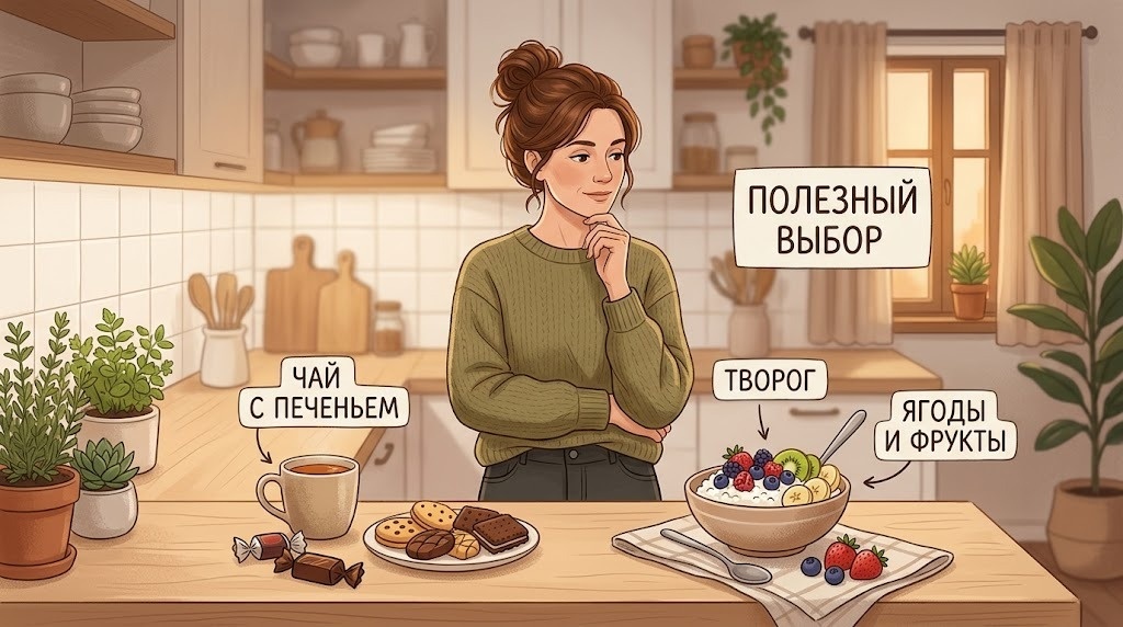 Я как провизор давно заметила одну вещь. Люди редко переедают гречку или яйца. А вот сладкое почти всегда связано не только с голодом, но ещё с усталостью, привычкой, тревогой и тем, что лежит под рукой. Соседка, назовём её Лена, долго считала, что у неё просто «нет силы воли». Днём она ела вроде бы нормально. Утром кофе, потом что-то на бегу, в обед суп или салат, иногда йогурт. А вечером начиналось знакомое многим: чай, печенье, конфета, ещё одна, потом мысль «ну я же весь день держалась». Наутро было раздражение на себя, обещание «собраться», а к вечеру всё повторялось.