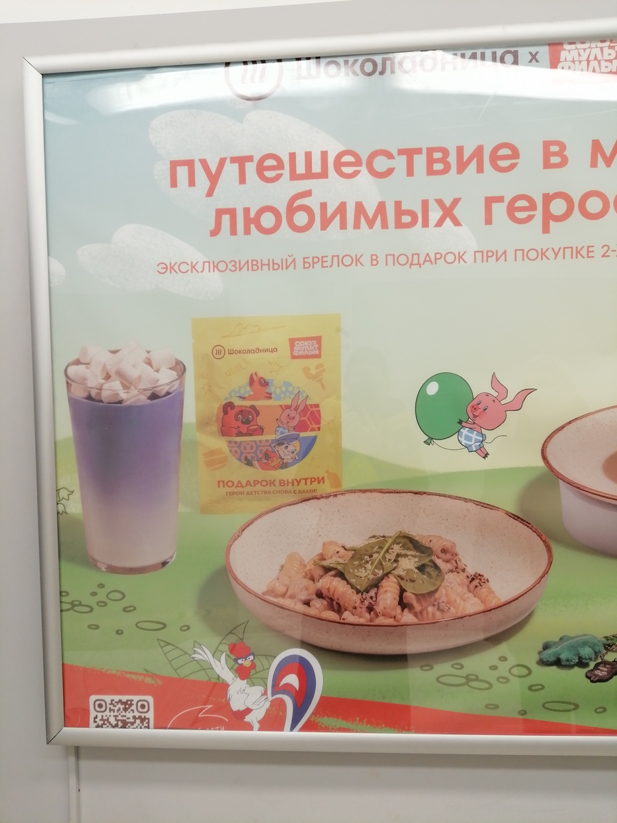 Вчера, когда мы с дедушкой шли от Д--и, увидели вот такое объявление И сразу сообщили об этом маме. Она сразу стала мониторить информацию, и вот,что мы узнали на сегодня. К 90-летию у Шоко и Союза произошла коллаборация. Во-первых, целая линейка меню, блюда по мотивам мультфильмов. При покупке 2х любых блюд дают брелок. Всего их в серии 9 разных. Под блюдом подразумевается не только еда, но и напитки. А их стоит брать: ведь они в лимитированных стаканах! Чтобы детям не было так обидно, для них тоже сделали блайнд-фуд: при заказе детского меню дают значок Кто уже участвовал в коллаборации Шоколадницы и Союзмультфильма? Кто вам попался? Кого хотели бы? Будете ли собирать всю серию или один для памяти возьмете?