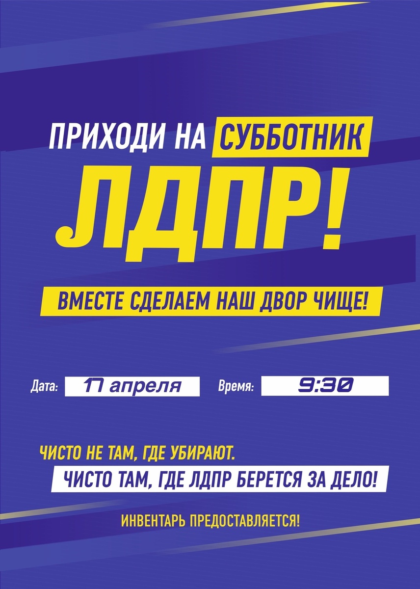 ! ЛДПР снова берётся за дело. Приглашаем всех на субботник — покажем, что порядок начинается с нас. 🗓 17 апреля, 9:30 📍Парк в честь 300-летия прокуратуры России ✔ Инвентарь предоставляется ✔ Хорошее настроение — обязательно Чисто не там, где убирают. Чисто там, где ЛДПР берётся за дело! Приходите — вместе быстро, весело и с толком наведём красоту. Ждём каждого!