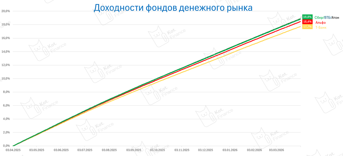 👉 Читайте нас, где удобно: Telegram (или в поиске @mkot_finance), Пульс, Max, Dzen В прошлых выпусках мы развенчивали мифы фондов денежного рынка, сравнивали доходность с ключевой ставкой (важно: КС без капитализации, как будто выплата 1 раз в год, как на годовом вкладе), фантазировали куда пойдут триллионы… Сегодня оценим доходность Годовая доходность крупнейших фондов за апрель 2025-март 2026 в диапазоне 17,7-18,8%. Кажется, разброс существенный. Но нет, и вот почему: 🔹любая корзина флоатеров обыгрывает LQDT. Это факт №1 🔹портфель ультра-коротких облигаций ВВВ-АА даст доходность выше, но из-за короткой дюрации динамика доходности также будет напоминать прямую. Это факт №2 Если вы принимаете нашу точку зрения, то у нас с вами будет и вывод схожий: фонды денежного рынка эффективны для краткосрочной парковки денег, и не подходят, чтобы инвестировать на годы. Знаем, что кто-то берет на 3 года под налоговую льготу ЛДВ, но экономического смысла в этом нет. Наверное, так спокойнее В наши