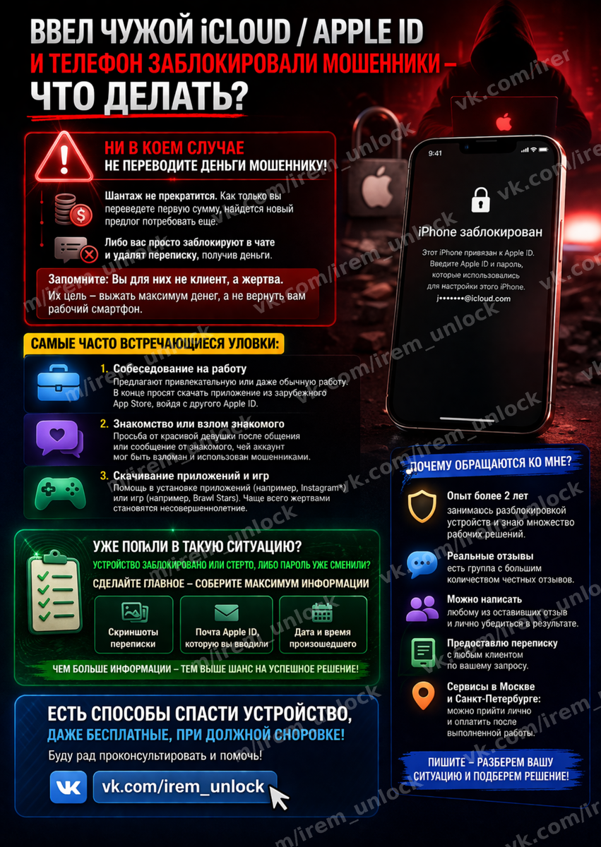 Ввел чужой iCloud / Apple ID и телефон заблокировали мошенники - Что делать?