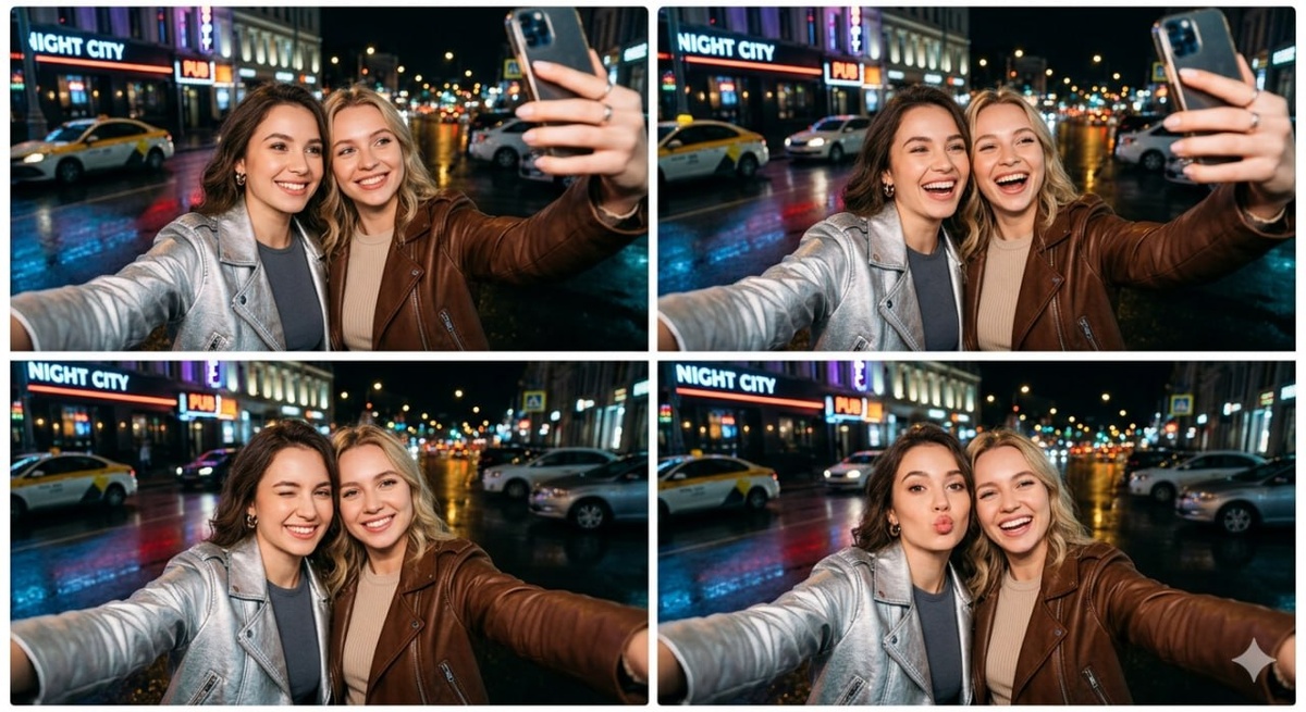 Подруги!!Новая категория на нашем сайте для подруг :) ## Описание сцены Коллаж из четырёх селфи двух молодых девушек на фоне ночного города. Ракурс съёмки — сверху, девушки расположены близко друг к другу. Необходимо точно перенести черты лица обеих девушек с загруженных фотографий. ## Внешний вид и одежда Девушка слева: облегающий топ тёмно-серого (графитового) цвета, поверх — байкерская куртка-косуха с серебристым металлик-эффектом. Девушка справа: коричневая кожаная куртка байкерского стиля, под курткой — светлый бежевый или молочный топ. ## Эмоции по кадрам Верхний левый кадр — обе смотрят в камеру с лёгкой улыбкой. Верхний правый кадр — обе открыто улыбаются. Нижний левый кадр — одна из девушек игриво подмигивает. Нижний правый кадр — одна из девушек делает kiss face («губы уточкой»). ## Фон и атмосфера Ночная городская улица после дождя. Мокрый асфальт отражает свет фонарей. На заднем плане — припаркованные автомобили, такси. Светящиеся вывески зданий создают атмосферу совре