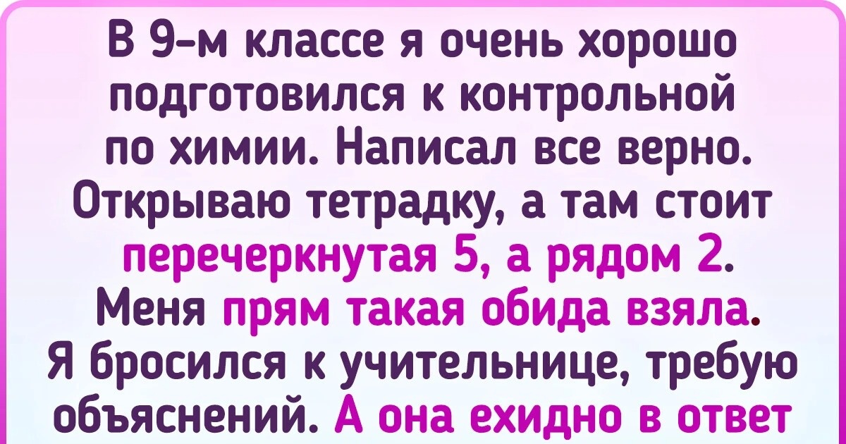 В 9-м классе я очень хорошо подготовился к контрольной по химии. Написал все верно. Открываю тетрадку, а там стоит перечеркнутая 5, а рядом 2. Меня прям такая обида взяла. Я бросился к учительнице, требую объяснений. А она ехидно в ответ: «Ты всегда у меня тройки получал, а тут написал на 5. Так не бывает. Списал, значит». © GoshaBaltika / Pikabu