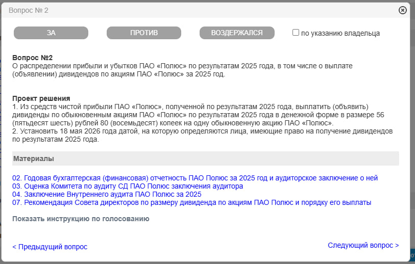 Если честно, я не помню, как я впервые на платформах регистрировался (и регистрировался ли вообще), но сейчас взаимодействие с ними очень простое: во всех трех случаях я просто логинюсь через ЕСИА (Госуслуги), и система автоматом подтягивает акции в моем владении и дает возможность ими голосовать. По Полюсу на платформе "Рост" подтянулся пакет акций из ВТБ-Инвестиций, но пока что не подтянулся из Т-Инвестиций. Но собрание только началось, прием голосов будет длиться до 6 мая - зайду через недельку, проголосую тиньковским пакетом. Проголосовал "ЗА" дивиденды в размере 56,80₽
