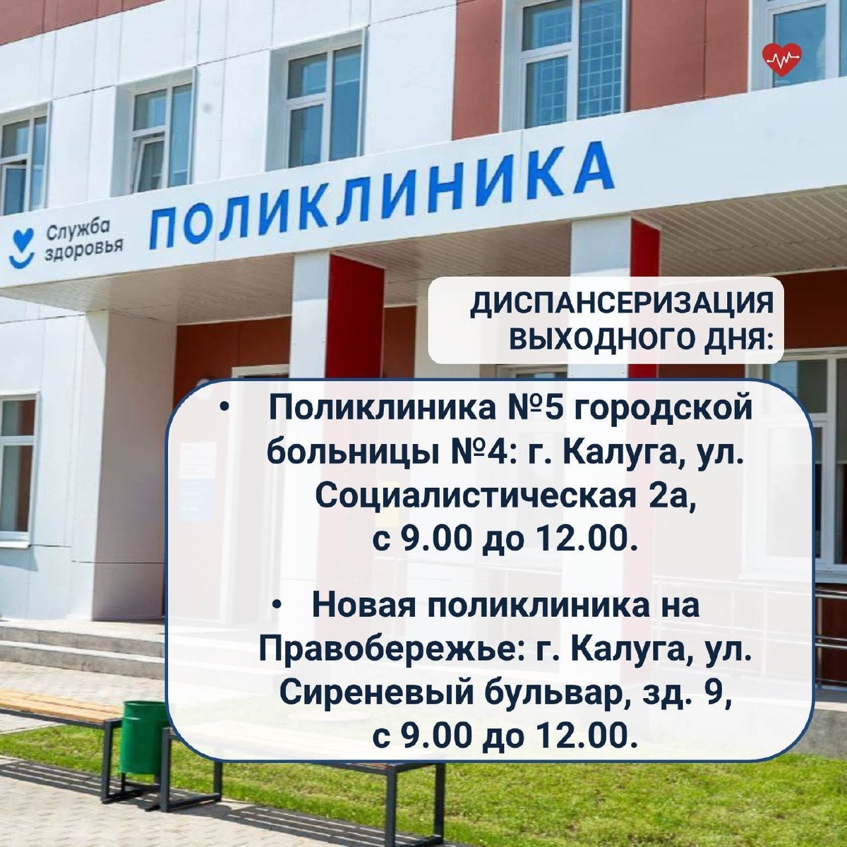 ? 18 апреля, в субботу, пройти обследования можно в: · Поликлинике №5 городской больницы №4: г. Калуга, ул. Социалистическая 2а, с 9.00 до 12.00. · Новой поликлинике на Правобережье: г. Калуга, ул. Сиреневый бульвар, зд. 9, с 9.00 до 11.00. Диспансеризация – это комплекс исследований, который можно пройти бесплатно в поликлинике для оценки состояния здоровья. Ее проходят граждане России 1 раз в 3 года в возрасте от 18 до 39 лет включительно (в 18, 21, 24, 27, 30, 33, 36, 39 лет) и ежегодно в возрасте 40 лет и старше. Раннее выявление — главный инструмент в борьбе с онкологическими заболеваниями, заболеваниями сердечно-сосудистой системы, легких, сахарным диабетом и многими другими неинфекционными заболеваниями, а профилактика — эффективный способ значительно снизить риски их возникновения.