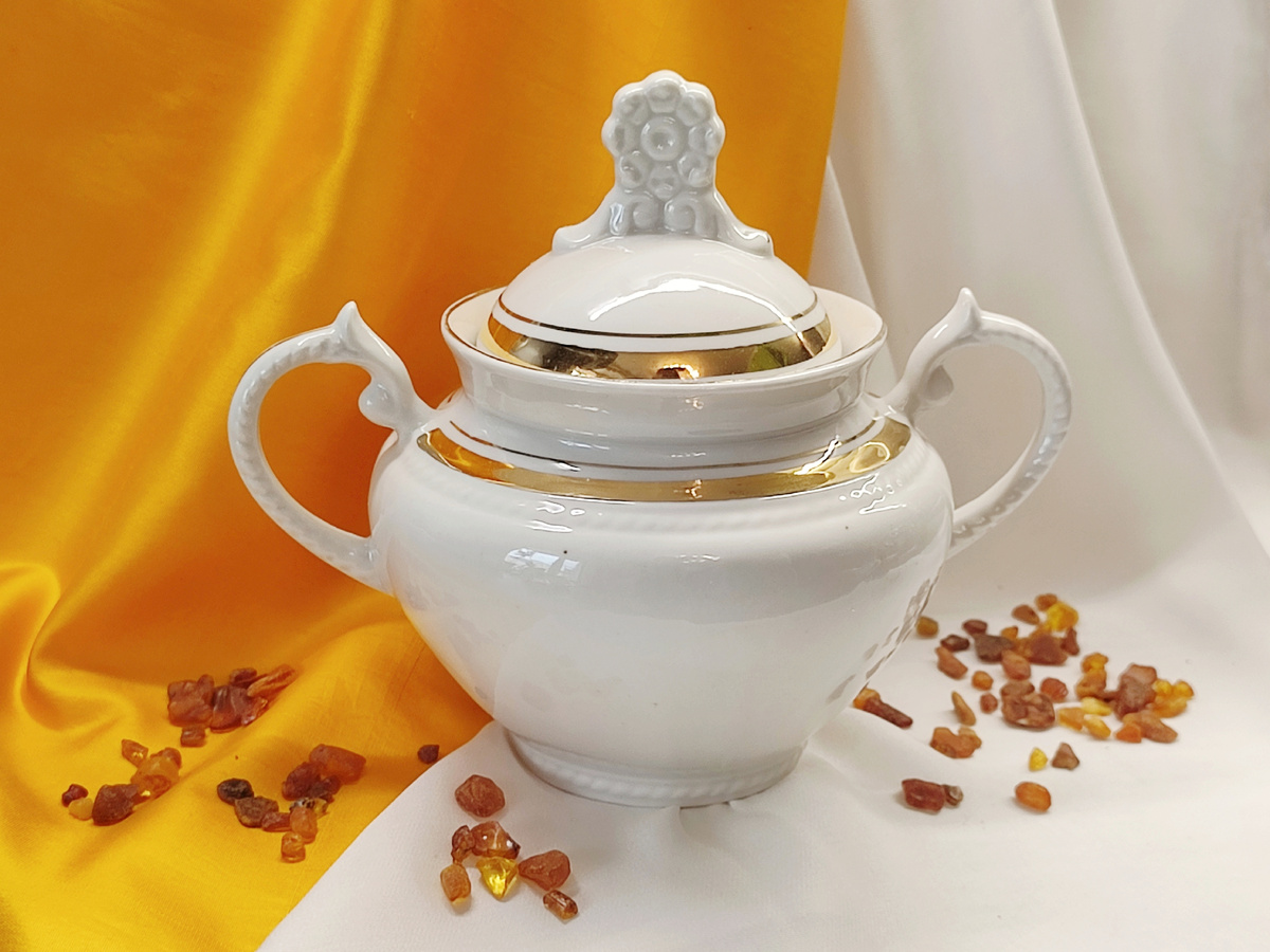 Декор - только золотые отводки. Одна толстая полоса и один тонкий усик на крышке и по широкой части самой сахарницы.