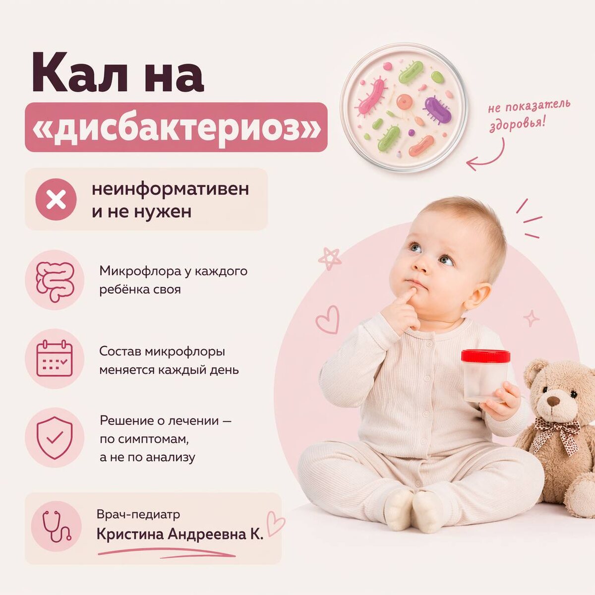 » Очень часто вижу, как этот анализ назначают детям, особенно малышам до года. Давайте честно: в большинстве случаев он не даёт полезной информации и не влияет на тактику лечения. ⬇️Почему так? ⏺️Наш кишечник — это сложная экосистема с огромным количеством микроорганизмов. И у каждого человека она своя. Более того, у детей микрофлора особенно динамична: в течение первого года жизни она активно формируется и постоянно меняется. Важно знать 👇 💬В норме в кишечнике могут присутствовать не только лакто- и бифидобактерии, но и: — кишечная палочка — энтерококки — стафилококки — клостридии и многие другие микроорганизмы И это ‼️не равно болезнь. 💚Даже у взрослого человека состав микрофлоры может меняться под влиянием питания, стресса, перенесённых инфекций и других факторов. Если сдавать этот анализ несколько дней подряд — результаты будут отличаться. И это тоже нормально. 📌В чём основная проблема анализа «на дисбактериоз»? Он не отражает реальную картину микробиоты кишечника и не им