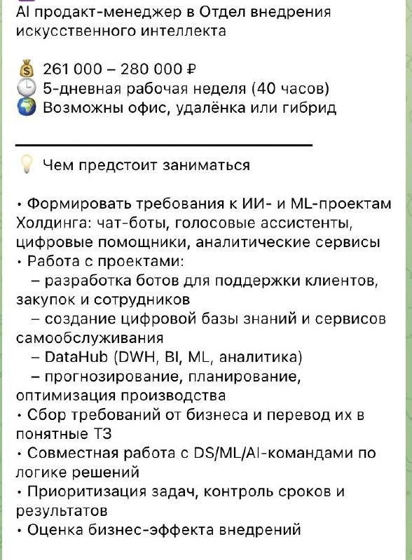 🤭 Таких много, это только одна из! Где-то требуется опыт, где-то нет. Но деньги везде больше, чем вам предложат в любой другой нише. Собственники готовы вкладываться в таких людей, потому что им проще заплатить сейчас больше среднего, чем потом оказаться вне волны 💰 И самое главное, что в таких вакансиях нет ничего, чего не умели бы мои ученики ❤️ То есть вы изучаете все мои уроки, настраиваете автоматизацию, которую потом используете как кейс в резюме (!), и превращаетесь в специалиста, который может получать такие деньги. Поэтому все, кого интересует заработок на ИИ, собственное развитие и образование, напишите моей помощнице Она подробно расскажет вам про обучение и насколько оно вам подходит 🙌